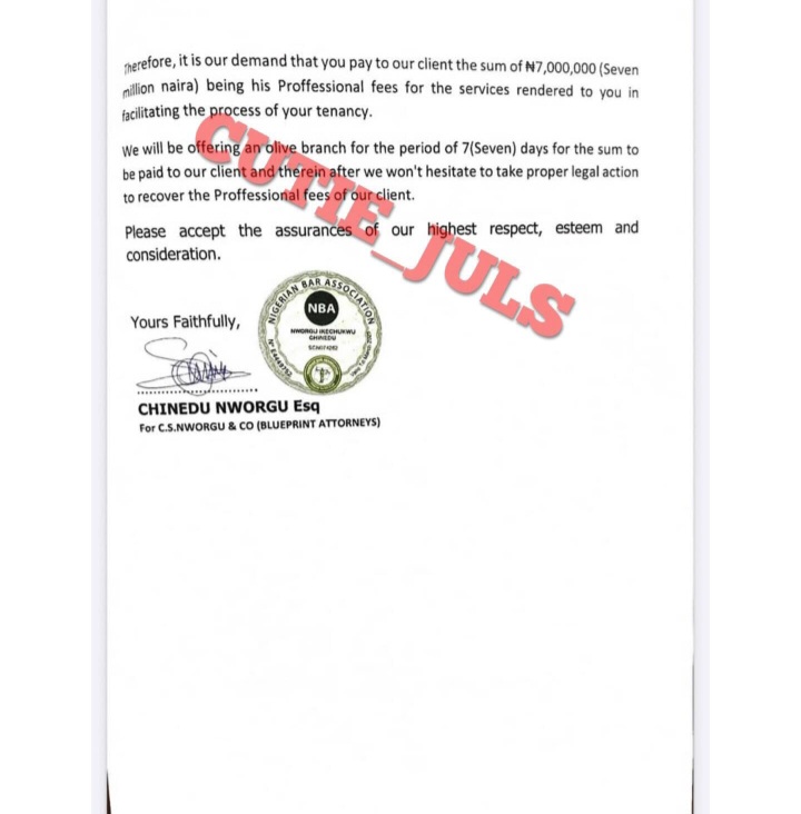 The documents further allege that the couple failed to pay professional fees amounting to ₦7 million to an agent who facilitated the tenancy. It was also claimed that after repeated demands, a cheque issued in settlement of the fees was returned unpaid.