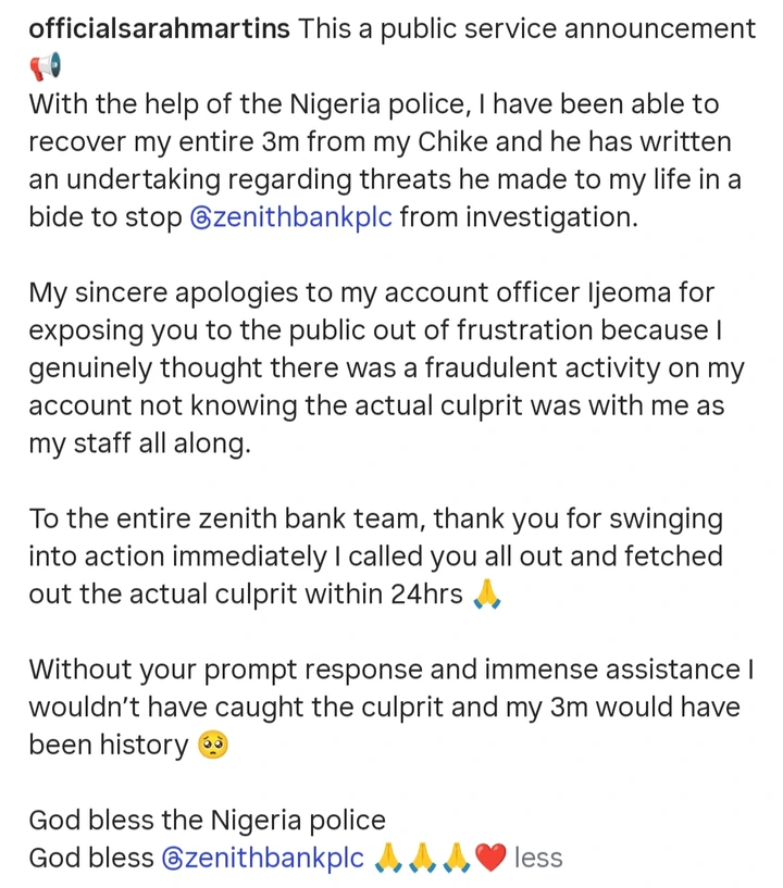 The actress disclosed this in a public statement shared on her official Instagram page, @officialsarahmartins. She explained that the money was recovered with the assistance of the Nigeria Police Force and was traced to her employee, identified as Chike, whom she said she had employed shortly before the incident.