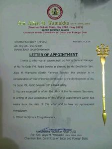 The statement while congratulating the officer on the appointment on behalf of the senator also urged him to redoubled efforts and use his vast knowledge to bring more positive development to the radio station and charged him to justify the confidence repose on him.