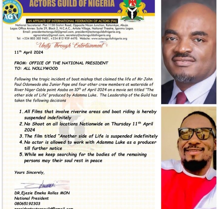 The Actors Guild of Nigeria (AGN) has suspended filming in riverine areas and taken decisive action against producer Adamma Luke in response to the tragic death of actor Junior Pope.