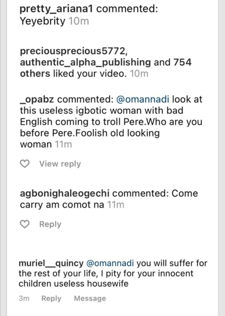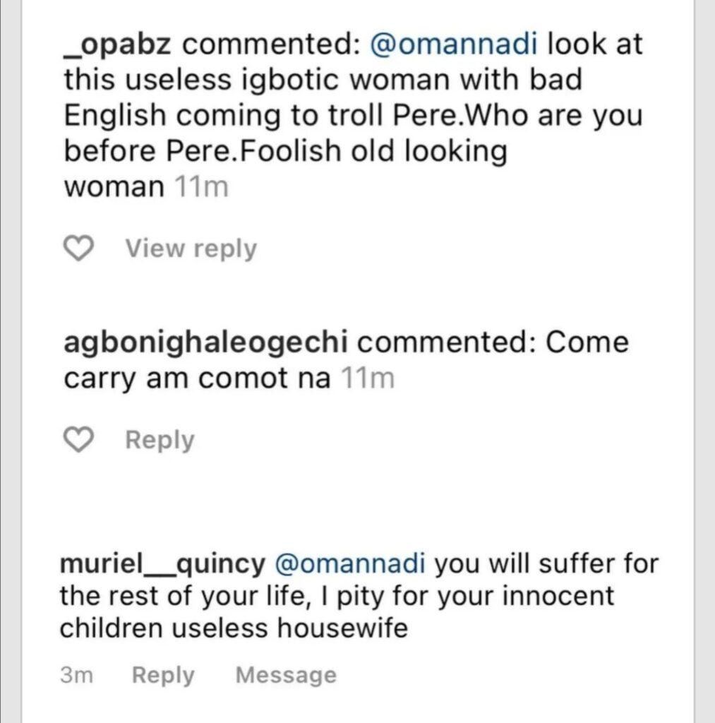Nnadi who wants Pere out, shared screenshots of some vile messages she received from those she believes are hardcore fans of the housemate.