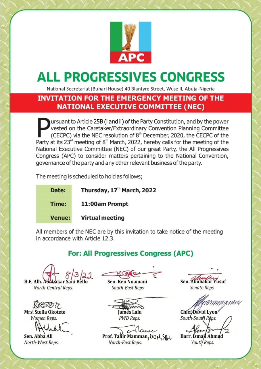 “The CECPC of the party at its 23rd meeting of 8th March 2022, hereby calls for the meeting of the National Executive Committee (NEC) of our great Party, the All Progressives Congress (APC) to consider matters pertaining to the national convention, governance of the party and any other relevant business of the party,” the communique read.