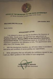 “I am pleased to inform you that His Excellency the Governor of Zamfara State, Dauda Lawal, has approved your appointment as Government House. Your appointment based on recognition of your experience competence and dedication to duty,” the letter signed by Mal Abuabkar M. Nakwada said.
