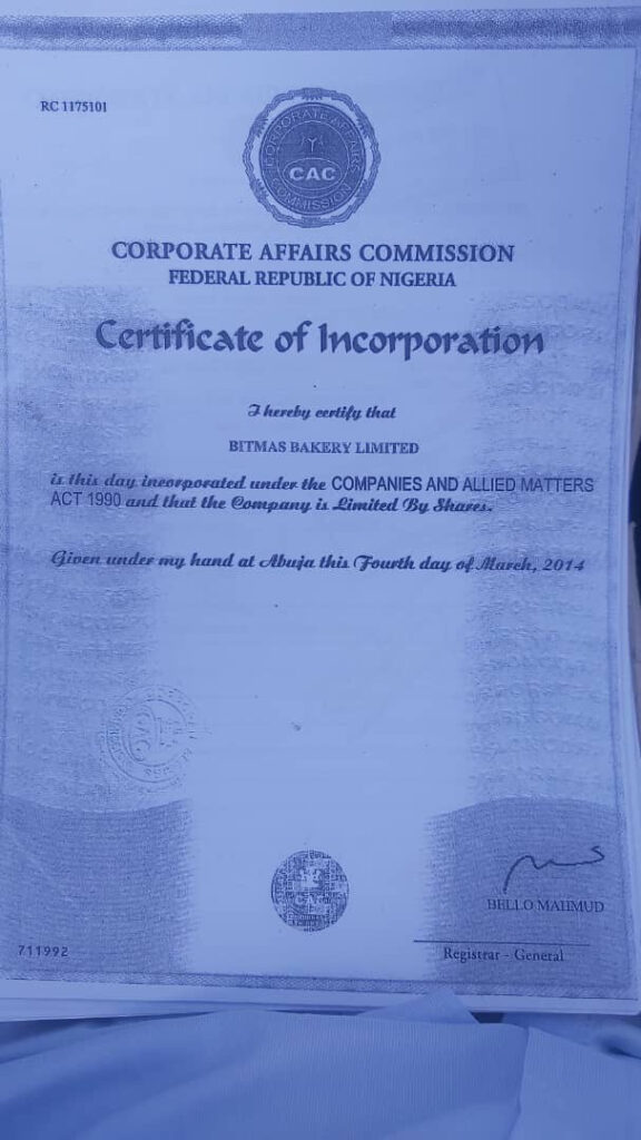 Copy of Certificate of incorporation showing Directors of Bitmas Bakery