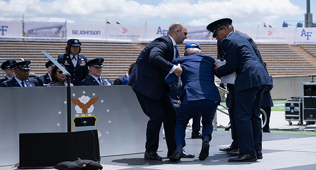 Biden, 80, who had delivered the commencement address to graduates of the military academy, had just shaken hands with a cadet and begun walking back to his seat when he fell.