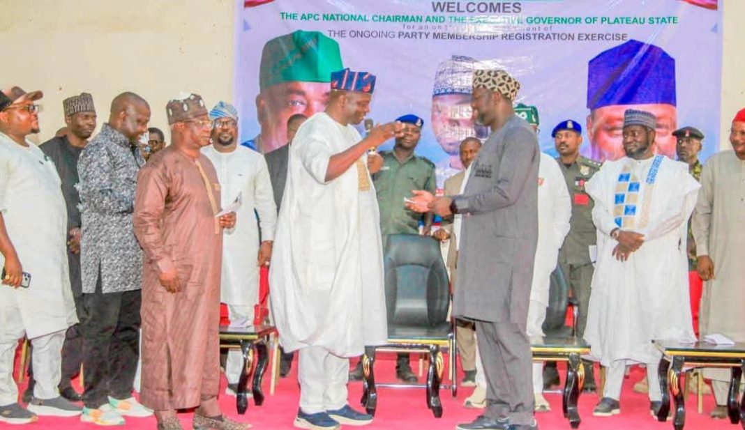 Executive Chairman of Langtang North Local Government Area, Hon. Pirfa Jingfa Tyem, has officially received his All Progressives Congress (APC) membership card from the party’s National Chairman, Professor Nentawe Yilwatda. The presentation took place on Thursday at Christ College of Theology and Education, Pyal, during the APC’s E-Registration assessment visit to Langtang North.The event, described as a registration and unity rally, attracted party leaders, government officials, traditional rulers, and stakeholders from across Plateau State.