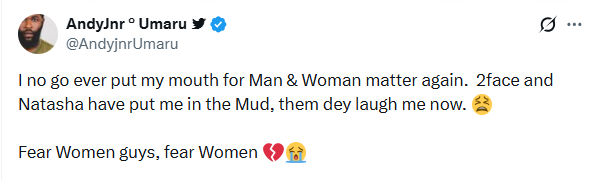 “I will never put my mouth in man-and-woman matter again. 2Face and Natasha have put me in the mud; people are laughing at me now. Fear women, guys—fear women,” he wrote.