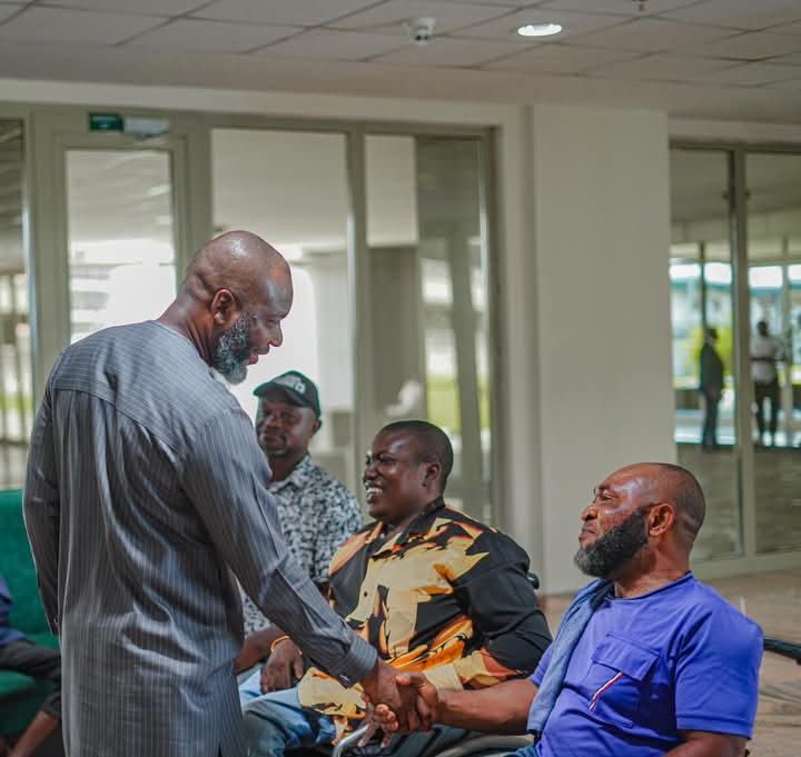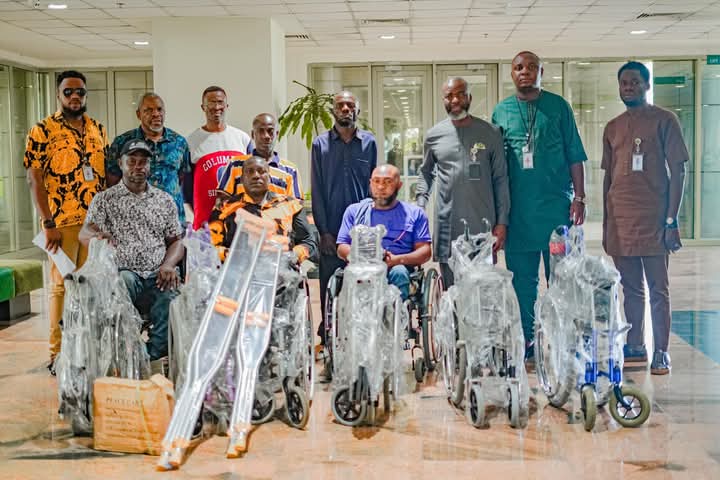 The Nigerian Content Development and Monitoring Board (NCDMB) donates mobility equipment to the Joint National Association of Persons with Disabilities (JONAPWD) Bayelsa State Chapter at the Nigerian Content Tower in Yenagoa, Bayelsa State.