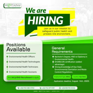 The Waste Management Consultant to Oyo State Government, Mottainai Recycling Ltd has announced its plan to recruit about 200 Environmental Health Officers.