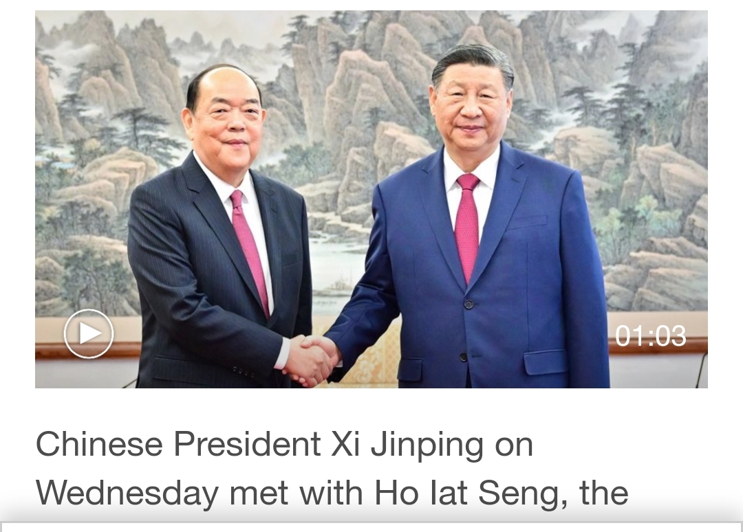 Chinese President Xi Jinping on Wednesday met with Ho Iat Seng, the outgoing chief executive of the Macao Special Administrative Region (SAR), expressing the central authorities’ full acknowledgment of the work of Ho and the fifth-term Macao SAR government.