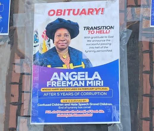 The obituary pictures of the over 59-year-old Vice-Chancellor were pasted in the front of her office and strategic areas of the campus to mock the woman who was described ‘as full of pride high handedness.’