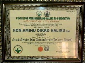 Aminu Haliru Dikko mni, the Chief of Staff to the Sokoto State Government, has been honored with the prestigious Service Star Award (Service Delivery Award) by the Center for Patriotism and Values Re-orientation.