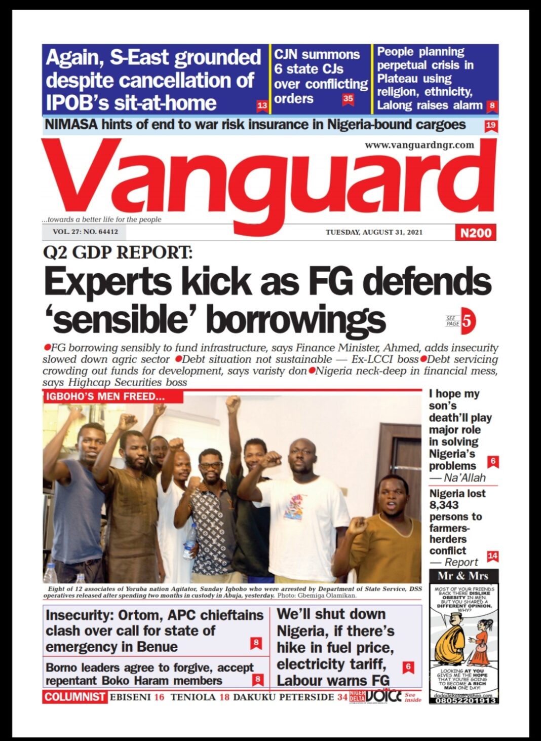 Nigerian NewspapersLess than 1 min.ReadToday’s Major Nigerian Newspapers Cover Stories-31-08-2021By Our CorrespondentAugust 31, 2021FacebookTwitterPinterestWhatsAppLinkedinTumblrTelegram TagsNigeria newspapersHot this week NewsJaja, Jaji Transmission Substations Receive New Power Transformers By Jabiru HassanThe Kaduna Region of the Transmission Company... NewsFG Youth Opportunity Summit Engages 12,000 Young Nigerians, Mobilises 255 Volunteers The Federal Government says its Youth Opportunity Summit has... NewsCourt Orders Arrest of Social Media User, Revokes Defendant’s Bail in Defamation Case By Ogenyi OgenyiA Federal High Court in Lagos... NewsContempt: Court orders arrest of Asekun, revokes Richard’s bail By Ogenyi OgenyiA Federal High Court in Lagos has... NewsEFCC, Aviation Security Strengthen Partnership to Curb Illicit Financial Flows By Francis WilfredThe Kano Zonal Directorate of the...TopicsAgricultureArtsBBNaija UpdatesBook ReviewBusinessBusiness and EconomyChinaColumnistsCoronavirusCrimeCultureDatingDefence/SecurityEconomyEditorialEducationEncounterEnergyEntertainmentEnvironmentFashionFashion & StyleFeaturedFeaturesForeign NewsHeadlinesHealthHouse of RepresentativesInspirationInterviewJudiciaryLifestyleMagazineMetroMoneyNewsNigerian NewspapersOpinionparliamentaryPersonalityPoetryPoliticsPress ReleasePress StatementRed DragonRelationshipReligionScience and TechnologysecuritySkincareSportsStyleTechToday's football matchesTravelWeatherMore NewsGOCMEJ APPLAUDS THE RE-APPOINTMENT OF NSCDC COMMANDANT GENERAL, PROF. AHMED ABUBAKAR AUDI The Guild of Civil Societies and Media Executives for... NewsMy credentials are valid, Deputy Speaker, Kalu denies alleged certificate forgery By Our CorrespondentThe Deputy Speaker of the House of... NewsThe Power List: Women Driving Gender Advocacy in Nigeria International Women’s Day Special FeatureVoices of Impact: The Advocates... NewsUba Sani Urges Journalists to Remain Vigilant Against Threats to Democracy By Achadu Gabriel, KadunaKaduna State Governor, Senator Uba... NewsWorld Bank Commends Kogi Governor Ododo for Expanding Healthcare Access From Noah Ocheni, LokojaThe World Bank has commended... NewsGunmen Kill One, Abduct 13 in Multiple Attacks Across Kogi Communities From Noah Ocheni, LokojaSuspected kidnappers have killed one... NewsContempt: Court orders arrest of Asekun, revokes Richard’s bail By Ogenyi OgenyiA Federal High Court in Lagos has... NewsOborevwori Says Delta Becoming ‘No-Go Area’ for Opposition as State Commissions New Roads By Anne AzukaDelta State Governor, Rt. Hon. Sheriff...Related ArticlesCACOL Calls for Release of Protesters Arrested Over Demolition Protests in Lagos Nigerian Newspapers My Dear Beloved People of Benue Nigerian Newspapers Day 2 of Nationwide Protests: Nigerians Continue Demonstrations Against Economic Hardship Nigerian Newspapers Nigerian Newspapers: Saturday Morning Update in 10 Points News Nigerian Newspapers: Friday Morning Update in 10 Points Headlines Popular CategoriesNewsPoliticsEntertainmentSportsBusiness and EconomyChinaPrevious articleKaduna retired blind civil servants cries out for HungerNext articlePastor Paul Enenche’s daughter causes stir on social media with her fashion sense