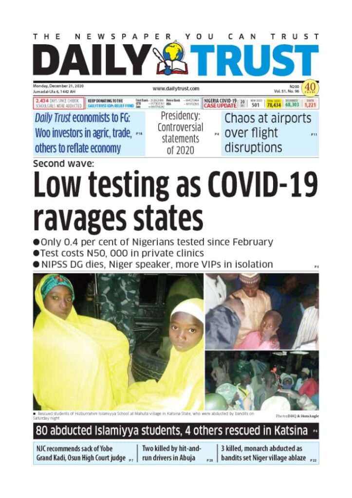 Today’s Nigerian Newspaper’s Frontpage 21- December -2020