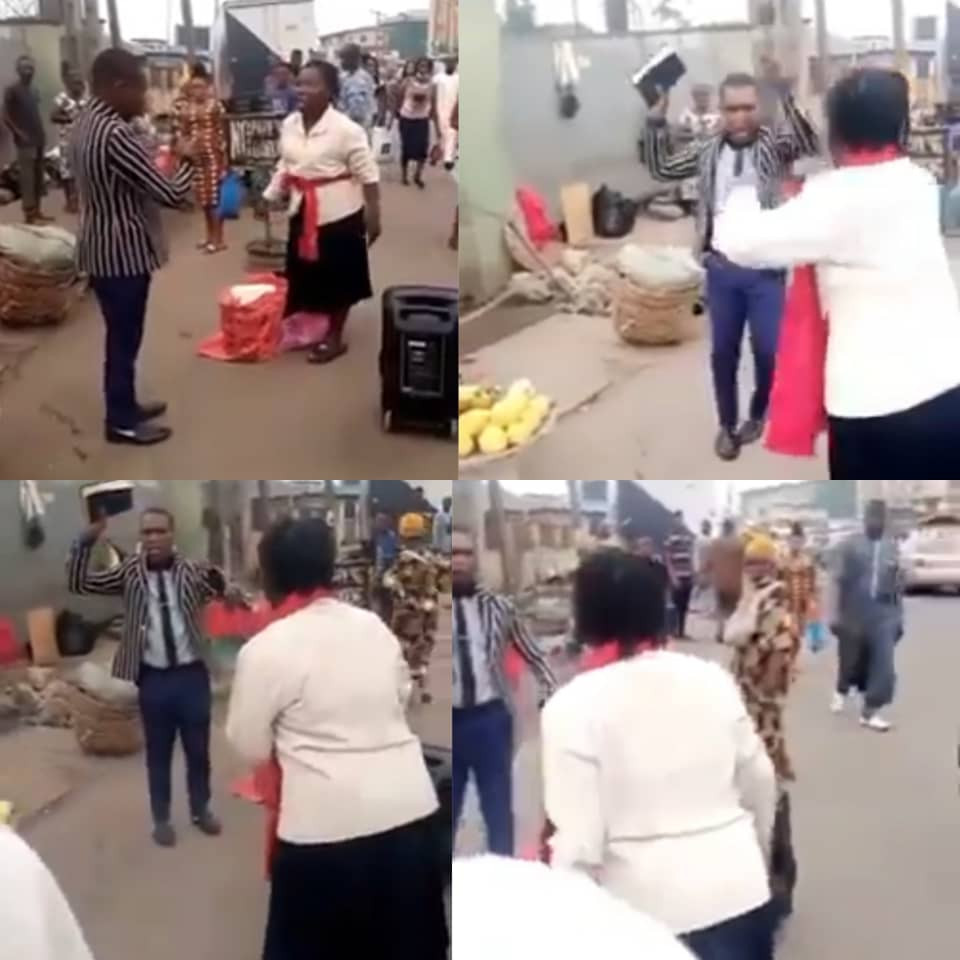 A male and female preacher who reportedly went separately to share the word of God at the Ikeja bus stop in Lagos state, threw caution to the wind as they fought for a preaching spot in the area.